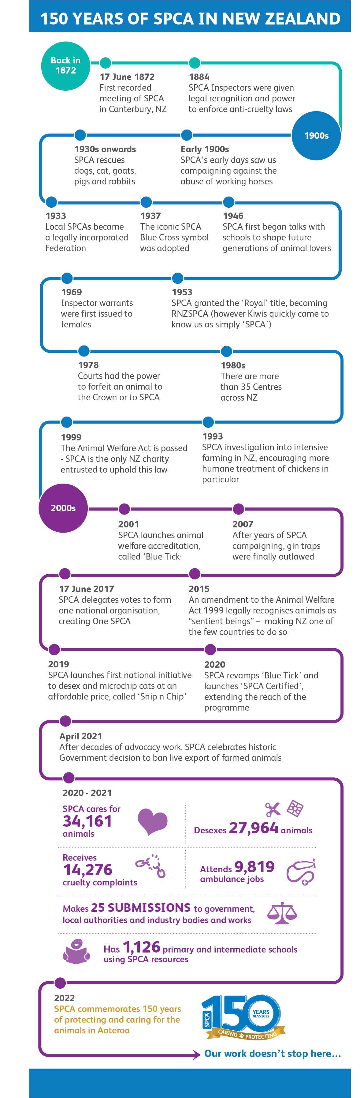 SPCA (Royal New Zealand Society for the Prevention of Cruelty to Animals) has a history of more than 150 years of advancing animal welfare in Aotearoa New Zealand.