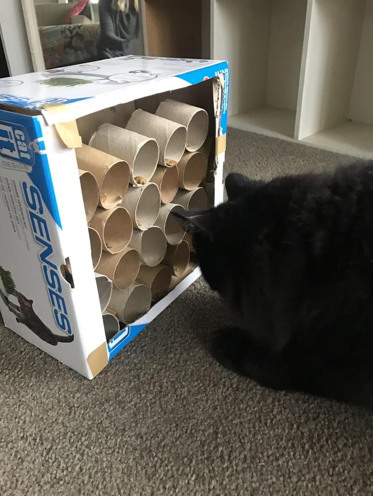 - Cut a few holes in a cardboard box, put food inside and hide the box somewhere in the house. Your cat will need to find the box, then move it around until the food comes out, or they scoop it out.