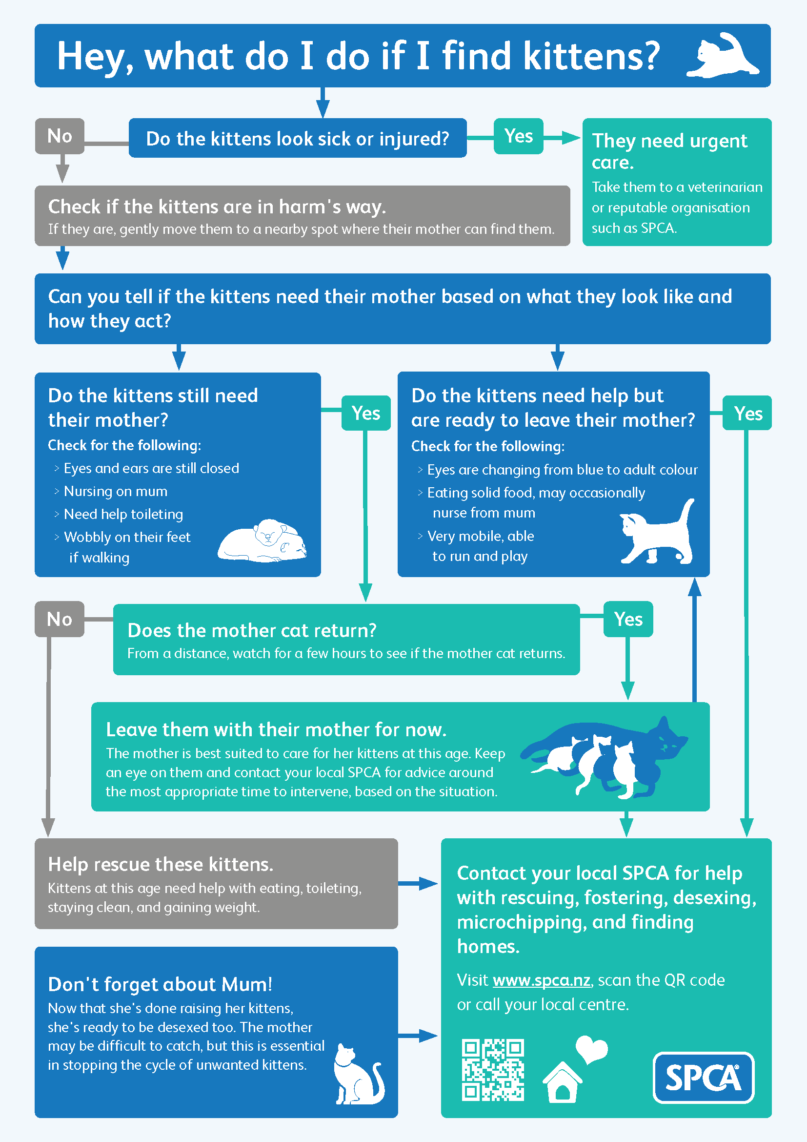 It is important to trap and desex mum as well as the kittens to stop the cycle of unwanted litters. SPCA can help you with this. SPCA runs regular desexing campaigns for owned pets, and work with local rescue organisations to desex stray cats in our community. You can read more about desexing
