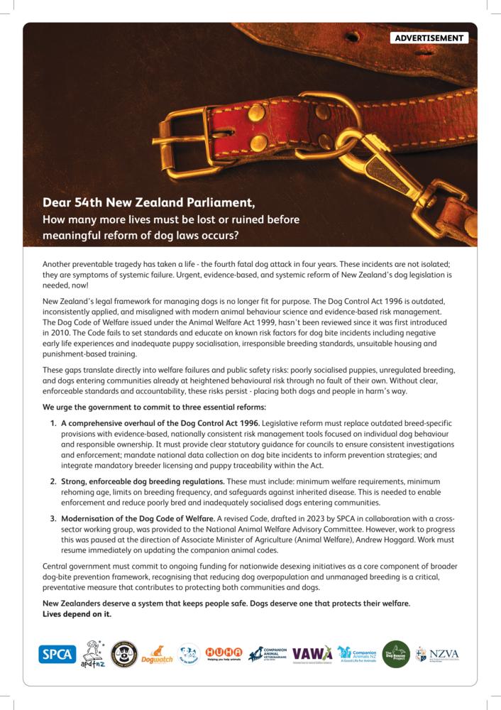 SPCA has joined forces with other key organisations to publish an open letter to the Government. Our message is clear: New Zealanders deserve a system that keeps people safe. Dogs deserve one that protects their welfare. Lives depend on it.