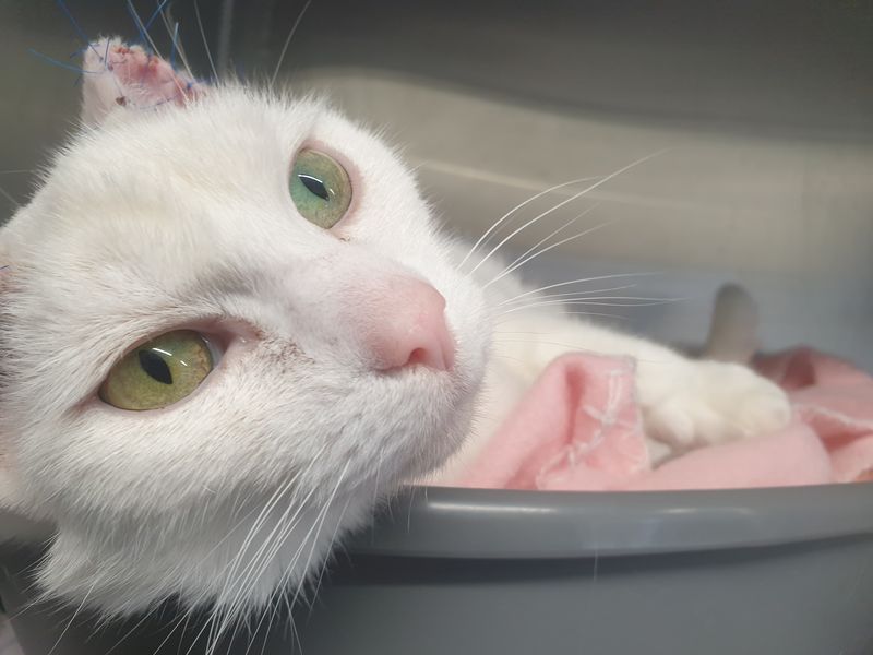 Animals with white hair and pink skin where fur is thin – particularly on the nose and ears – are at higher risk of sunburn. Wilbur was a stray cat who fell victim to this.