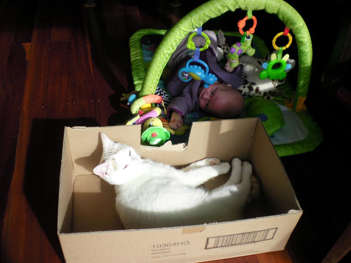 In my pregnancy I did some training to desensitise my dog and cats to baby sounds and movements. I followed a training programme involving sessions where I played baby sounds and moved around the room. This behaviour ensured the cats would be happy on their beds and cat trees in the same room.