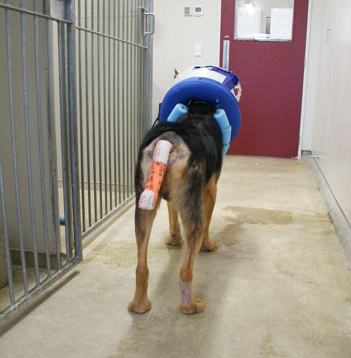 Post-surgery, though well on his way to recovery, Bear was clearly struggling with his new ‘cone of shame’ and used his Huntaway intelligence to let us know about it! After tearing off his bandages and wriggling free of his protective cone several times, the team needed to get crafty to contain the troublemaker. To the cone of shame were added two inflatable layers, plus a double wrapping of chew-proof bandages. Bear had met his match!