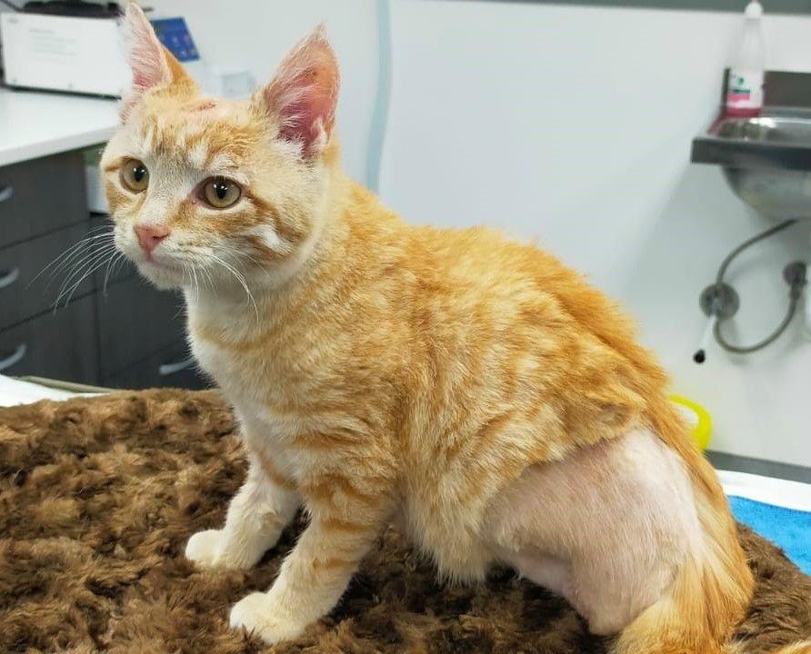 After weeks of treatment, rehabilitation and time in foster care, our team determined the best option for Stu was leg amputation. While the abscess had been drained and Stu looked normal, he wasn't able to jump and play like a normal cat should. Further examination determined the fragments had caused irreversible damage and Stu's shoulder was unstable, so his right leg and his shoulder blade were removed to prevent further implications down the track.