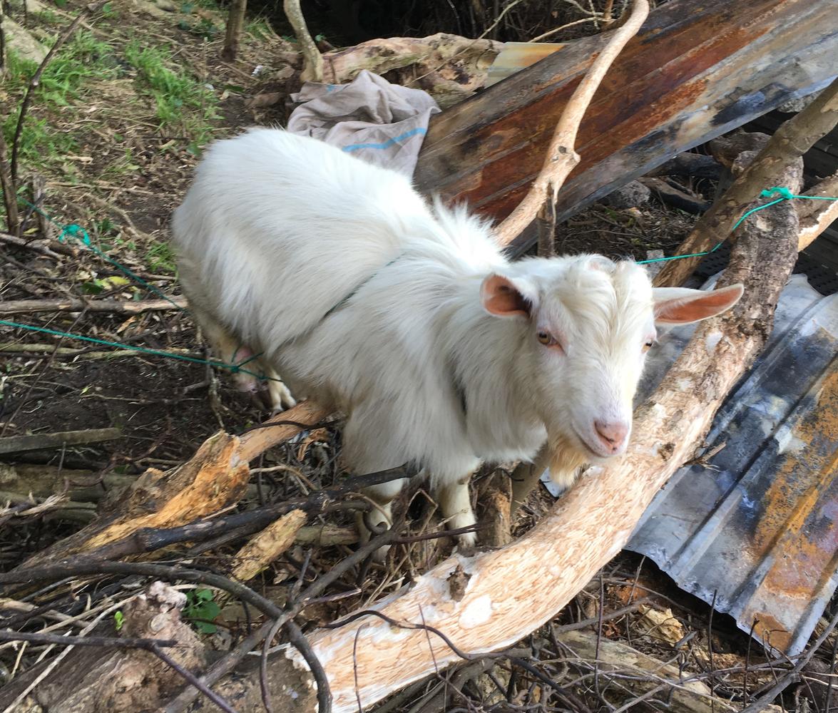 SPCA Inspectors found Gogo the goat tangled in a thin twine tether and caught on branches, unable to move, and desperately crying out for help.
