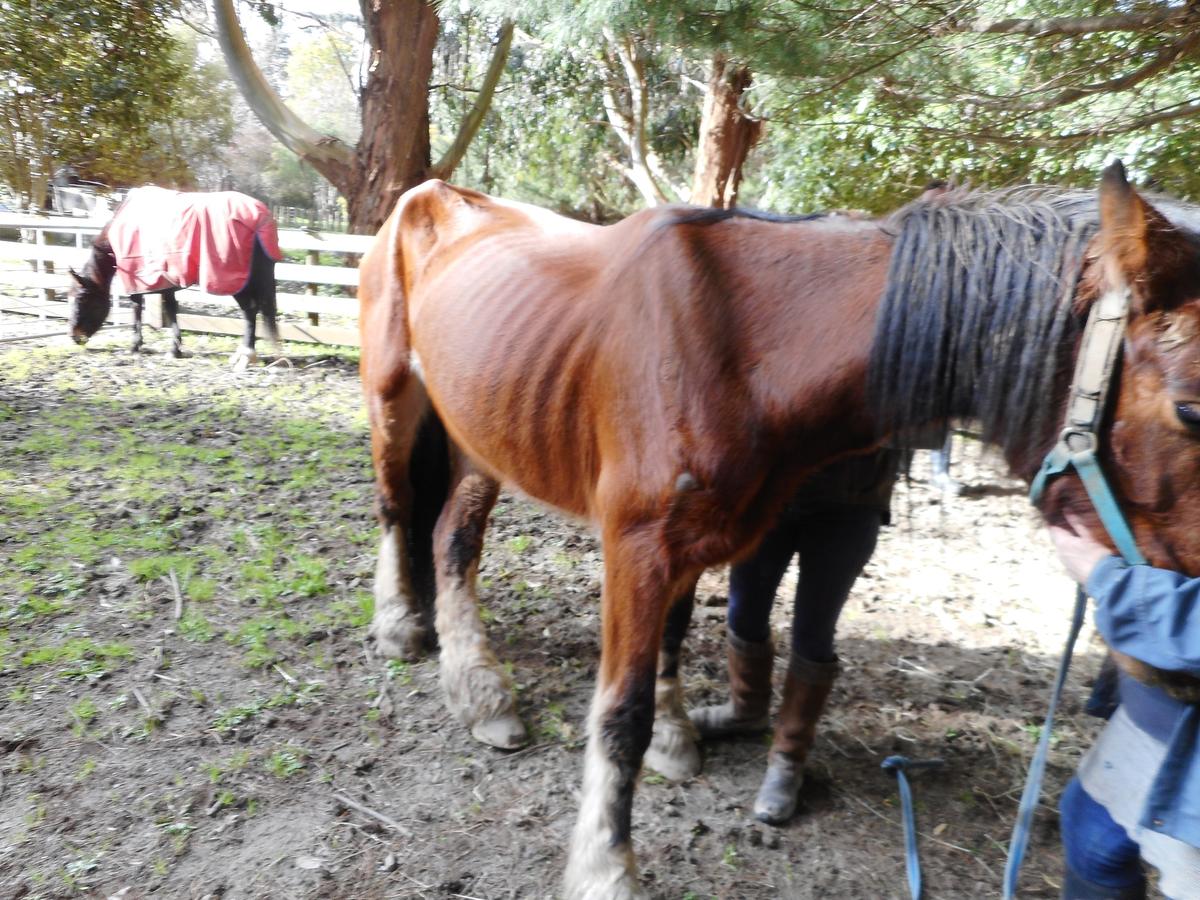 An SPCA Inspector issued a notice specifically directing the defendant to provide all her remaining horses 1-2 slices of hay daily, and give extra to the thinner horses still under her care. The Inspector returned a fortnight later. An underweight 8-year-old Shire named Keera was noted, and when the inspector checked on her a month later, her condition had not improved. Keera’s teeth and gums showed she had been eating very short grass or chewing on trees.