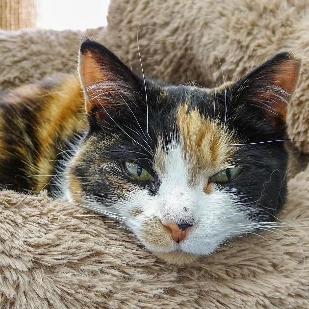 At first, Pebbles wouldn’t let anyone near her. Despite this, she never ran away, and refused to leave the hospital area - firmly deciding that it would be her home. Staff used to have to wrap her up like a burrito just to feed her, and she would hiss and growl like mad. Over time, she became socialised and even friendly! Before long she had a crate set up just for her and was designated the “clinic cat.” Over the years she’s become ever more relaxed, and in older age has developed into a lap cat who’s very affectionate.
